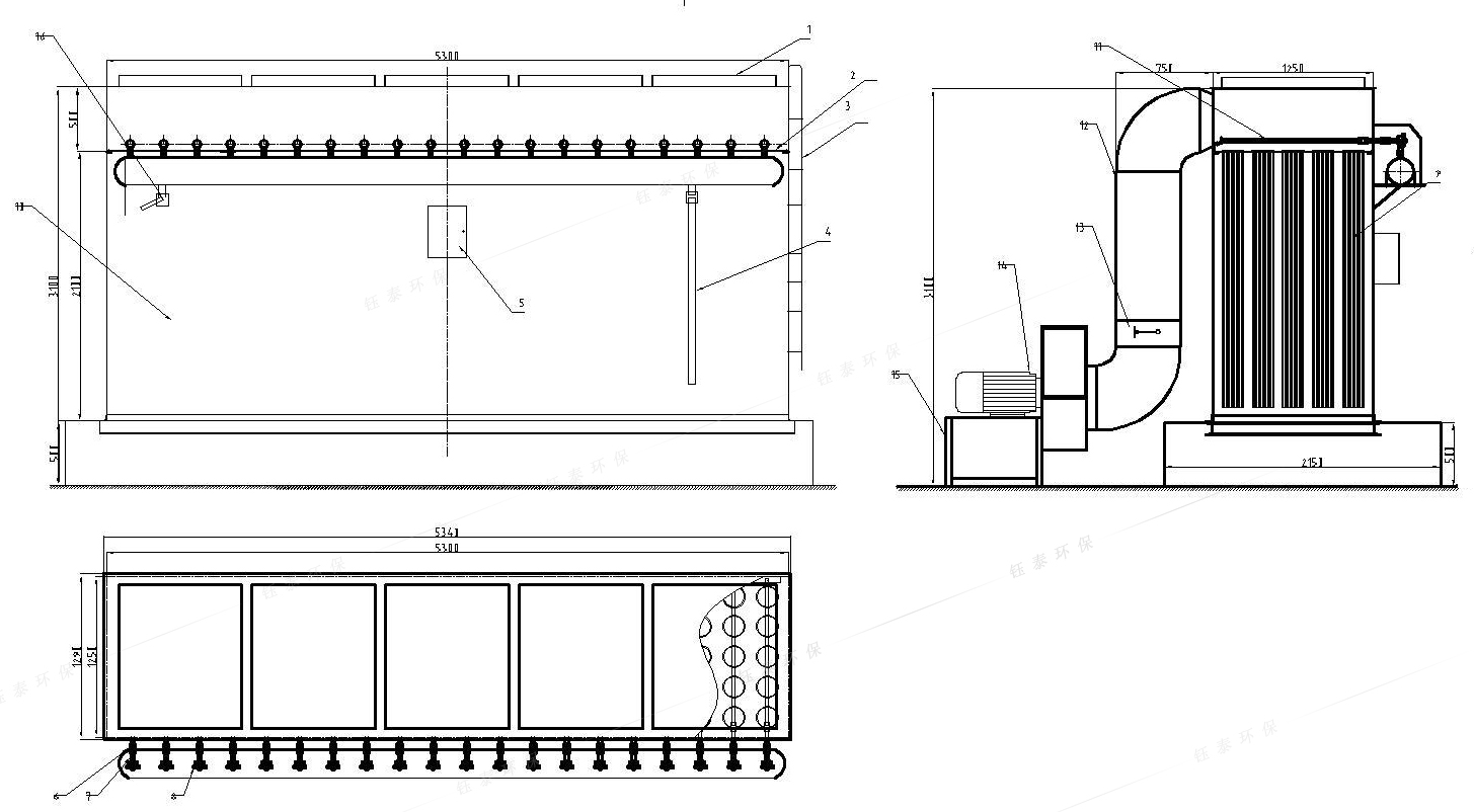 改造后,灰库的每单台库顶布袋除尘器技术参数:处理风量17000m3/h、过滤风速1.0m/min、过滤面积240m2,滤袋耐温135℃、抽尘风机出口含尘浓度≤10mg/Nm3。除尘器外型尺寸为原除尘器外壳尺寸:5.3×1.25×3.1m(高)